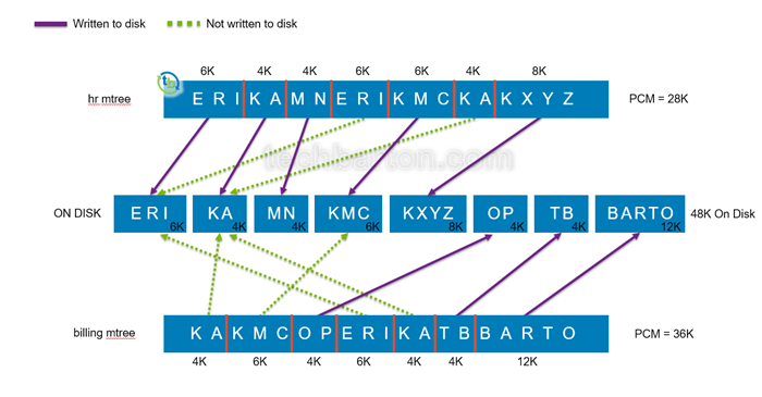 If you total up the PCM reports for the HR MTree (28K) and the Billing MTree (36K) it will total up to 64K which is more than what is actually sitting on physical disk.